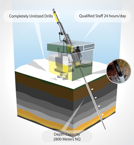 We perform surface drilling with wireline coring systems in PQ Diameter (85 mm), HQ Diameter (63.5 mm), NQ Diameter (47.6 mm) and BQ Diameter (36.5).